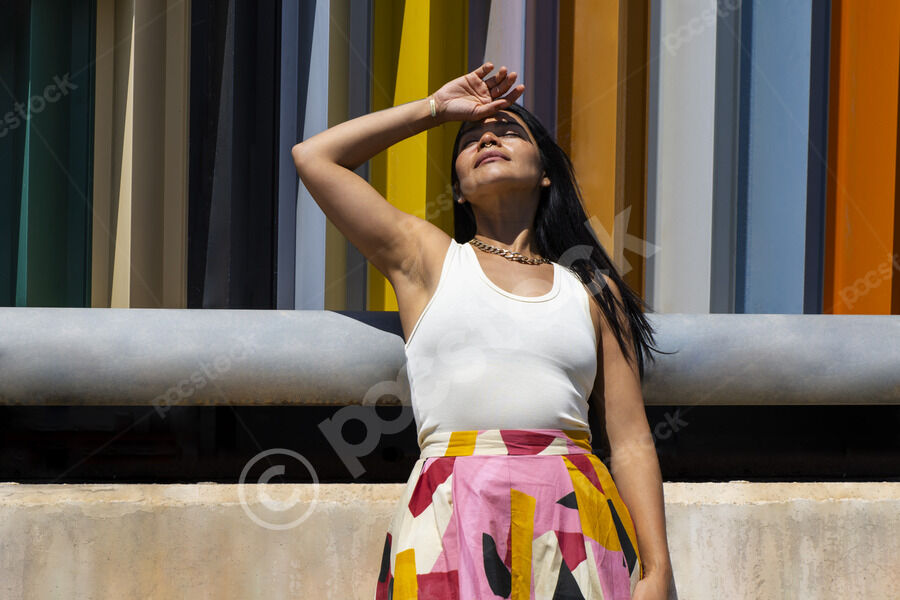 Hispanic woman wearing white tank top and floral long skirt leaning her hand on metal railing while standing barefoot and with closed eyes outside a colorful building on sunny day