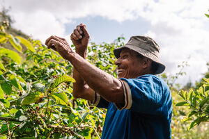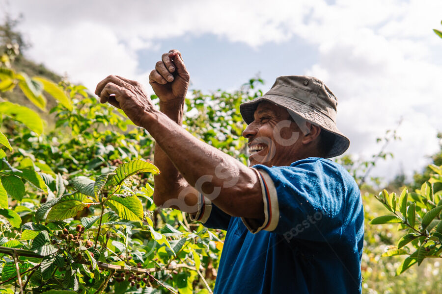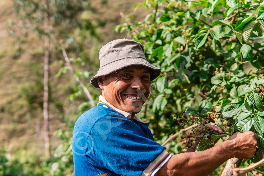 Hispanic male farmer wearing a hat harvesting blackberries while standing on farm during daytime
