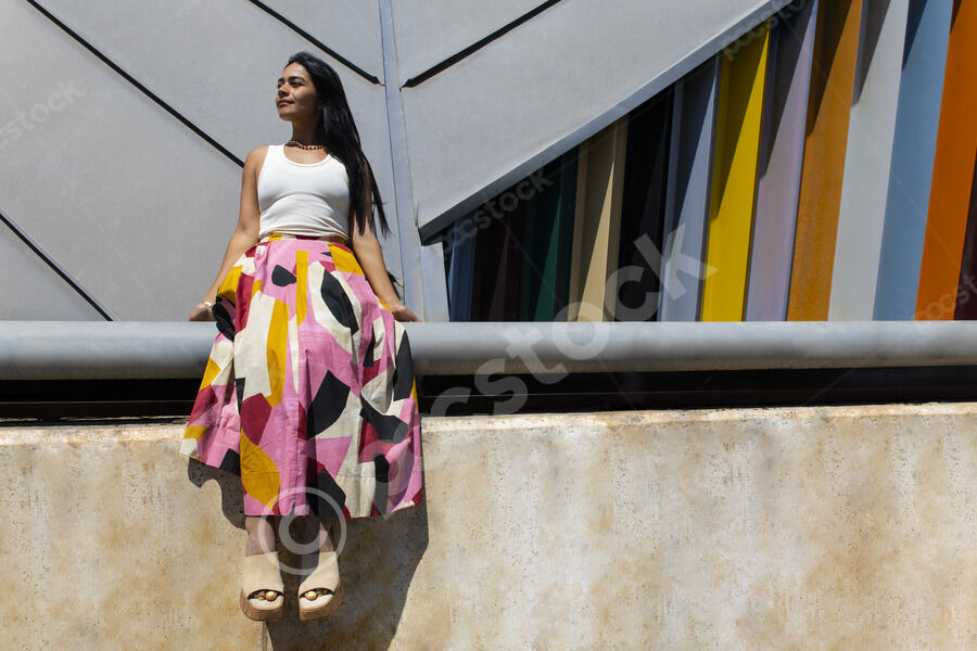 Hispanic woman looking away sitting on metal railing against slanted architectural structure with multi-colored ribbed facade outside the building on sunny day