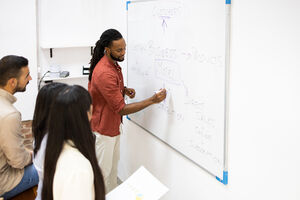 Hispanic male office worker writing on whiteboard and explaining business plans to male and female colleagues during meeting in office