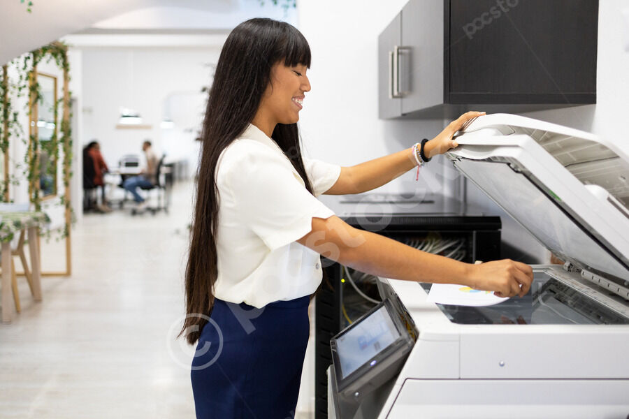 Smiling Asian female office worker standing and using photocopier machine in office