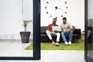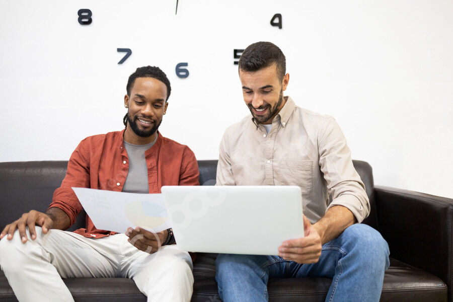 Smiling Hispanic male office worker with locks sitting on couch and working on laptop with caucasian male colleague in office