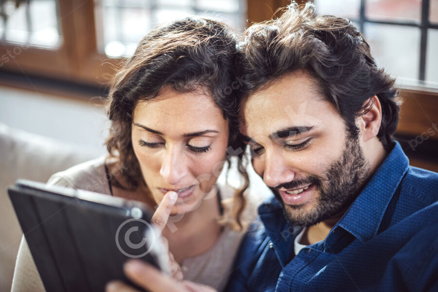 Hispanic couple sharing tablet sitting close together on sofa in living room at home