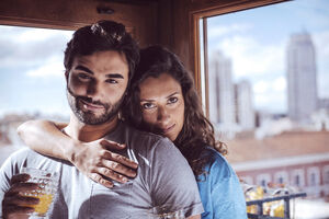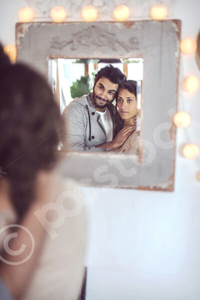 Hispanic man embracing girlfriend from behind while looking out the window at home