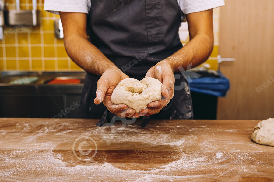 Male baker in apron standing at wooden table preparing dough for baking in bakehouse kitchen