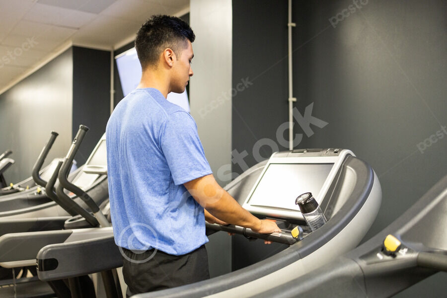 Hispanic man in headphones using smartphone while sitting on mat near dumbbells in gym