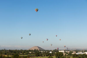 Hot air balloons in the sky over Teotihuacan's Pyramid of the Sun with a clear horizon