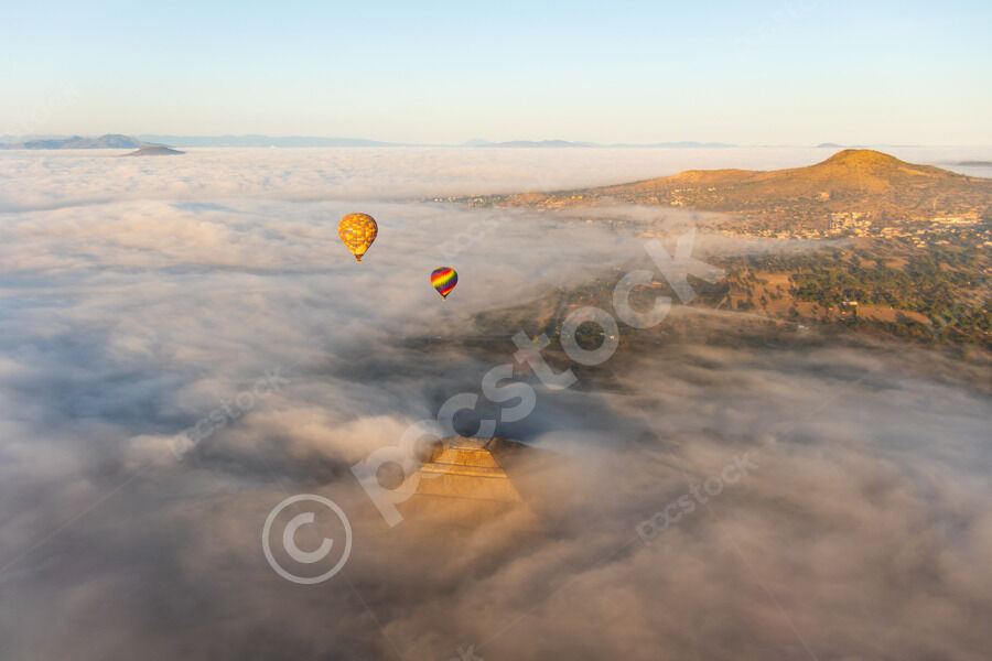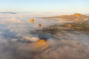 Hot air balloons rising above a dense cloud cover on the top of the Pyramid of the Sun at Teotihuacan during sunrise