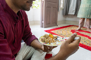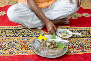 Indian woman puts oil on forehead of Indian man while sitting together during religious ceremony at home