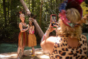 Back view of caucasian woman taking photo of Diverse group of tourists in front of tropical rainforest of Island