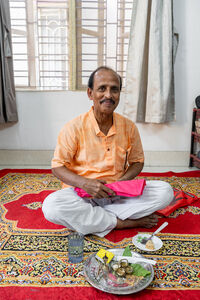 Indian senior man sitting on prayer rug preparing religious ceremony at home