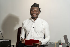 Black woman with disability taking selfie sitting in wheelchair in front of building during daytime