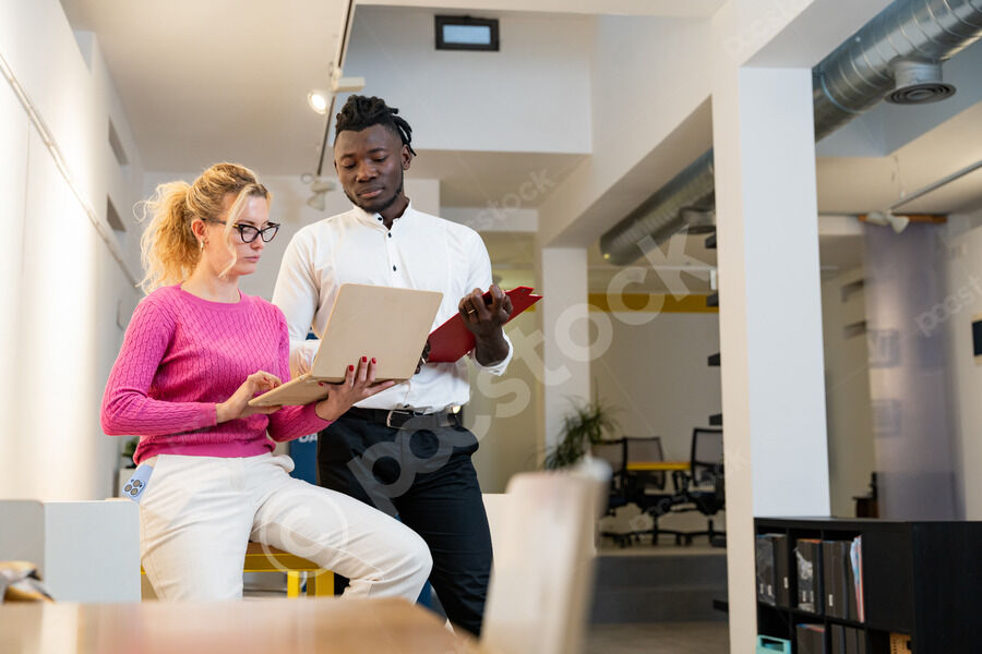 Black woman in wheelchair and Hispanic female colleague working together on laptop in front of building on sunny day