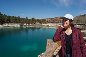 Smiling Asian female wearing cap turning around while recording video of olive trees in farm on sunny day