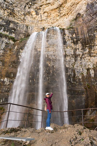 Hispanic Muslim woman in hijab wearing headphones on neck raising arms taking selfie while standing against rock formations on beach during sunset