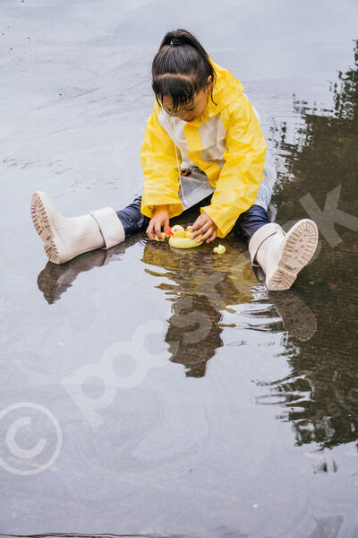 Hispanic girl in raincoat playing with plastic ducks sitting in puddle outdoors
