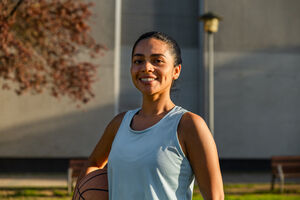 Smiling Hispanic woman holding basketball in her arm standing in park on sunny day