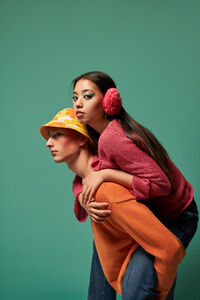 Black and Hispanic female engineers wearing hard hats and safety vests holding wind turbine model together standing in construction site