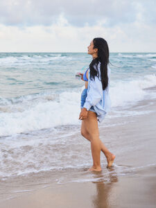 Black female engineer holding wind turbine model with Hispanic female colleague standing in construction site at sunset