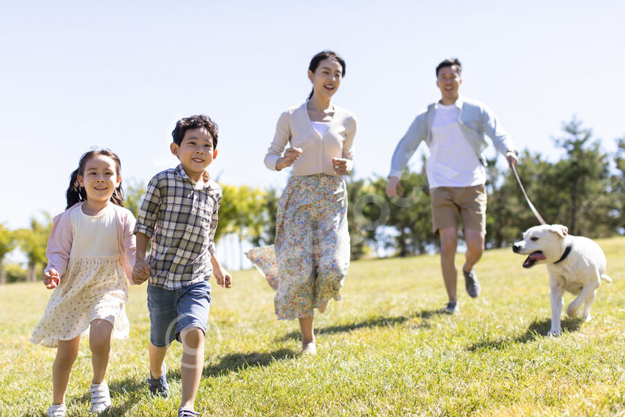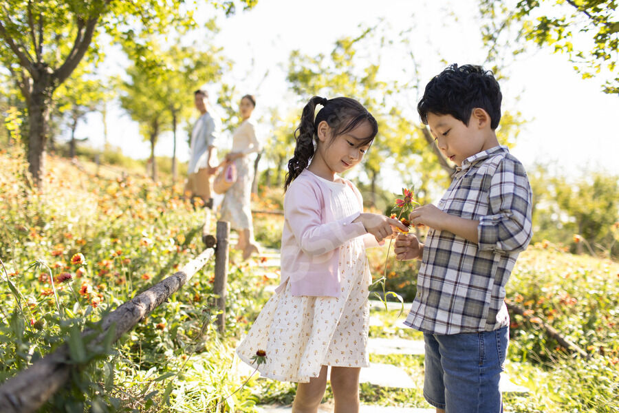 Chinese kids holding flowers standing on walkway with parents in park on sunny day