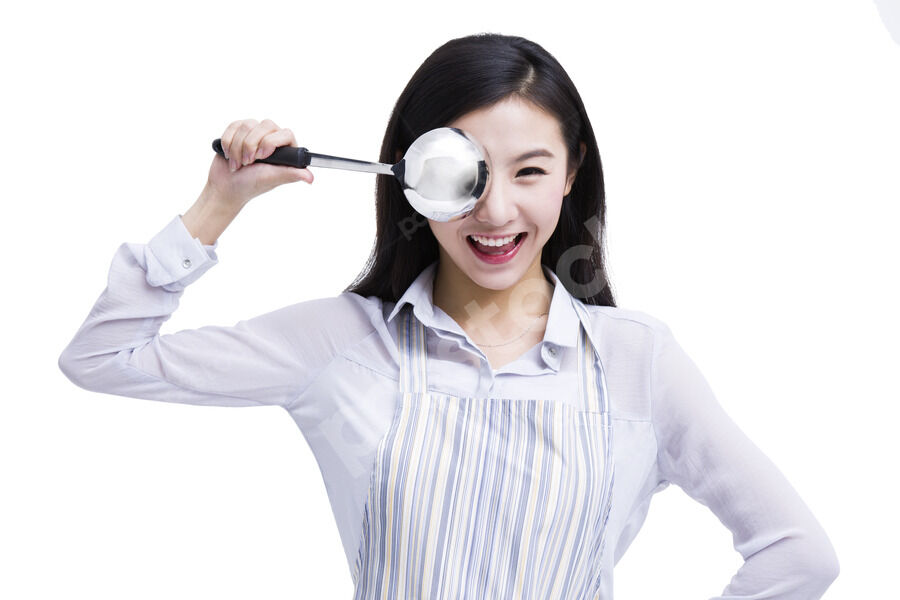Cheerful Chinese woman covering eye with kitchen ladle standing against white background in studio