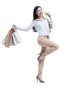 Chinese woman holding shopping bags and credit card standing with one leg up against white background in studio