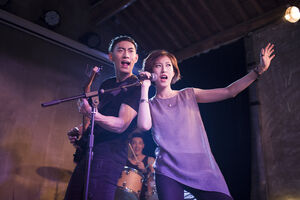 Chinese male vocalist singing while band members playing different musical instruments on stage