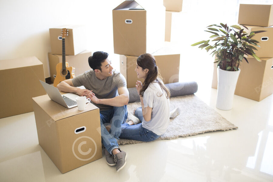 Smiling Chinese couple moving to a new house while sitting on floor with boxes at home