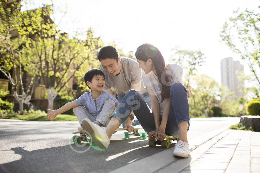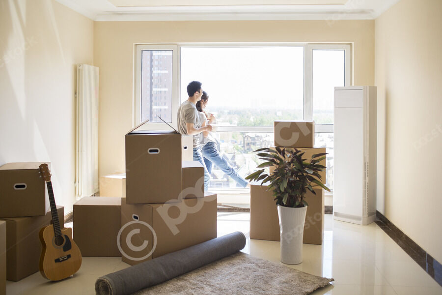 Chinese father giving high five to Chinese son while kneeling near boxes at home