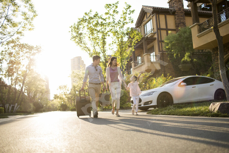 Smiling Chinese couple holding keys while standing outdoors on sunny day
