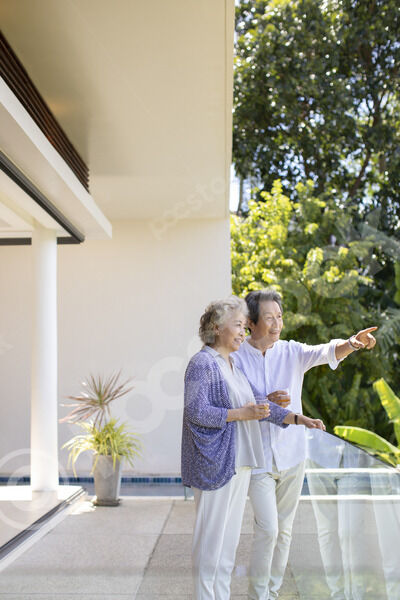 Smiling senior Chinese couple looking away while standing on balcony at home during daytime