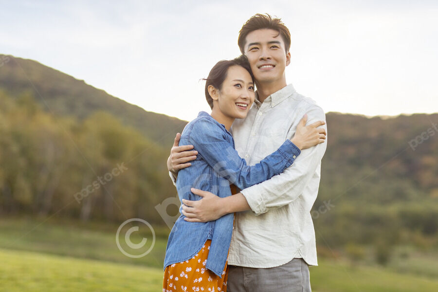 Smiling Chinese couple looking away hugging each other standing near mountain in park during daytime