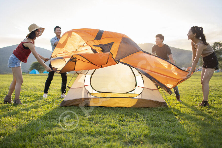 Smiling Chinese friends carrying backpacks holding tent and mat walking on forest road on sunny day