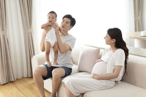 Serious Chinese male touching chin looking away while sitting crossed legs at home