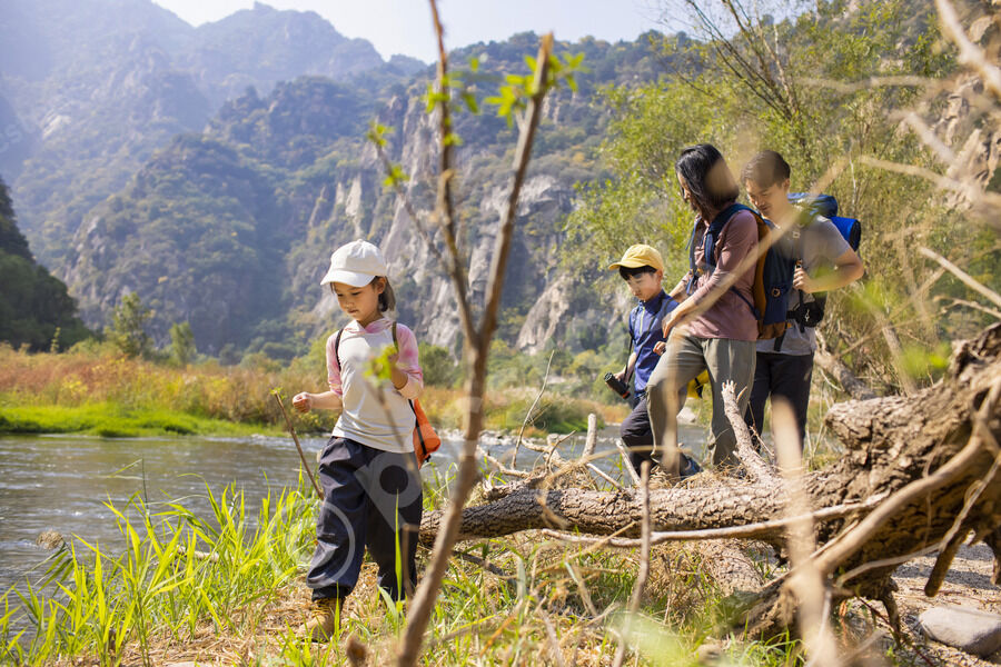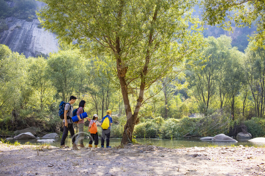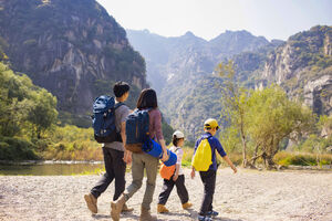 Smiling Chinese family hiker walking near lake against rocky mountain on sunny day