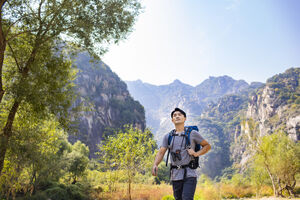 Chinese male hiker with backpack looking away while walking in forest against mountain on sunny day