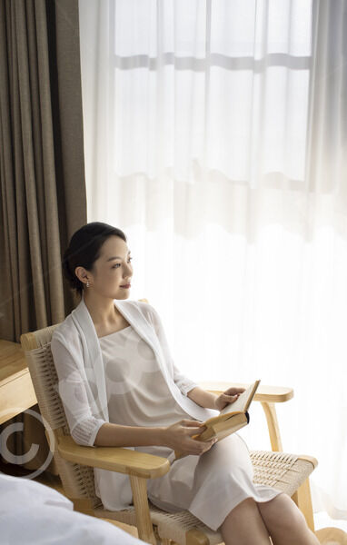 Smiling Chinese female reading book while sitting on chair with crossed legs in bedroom at home