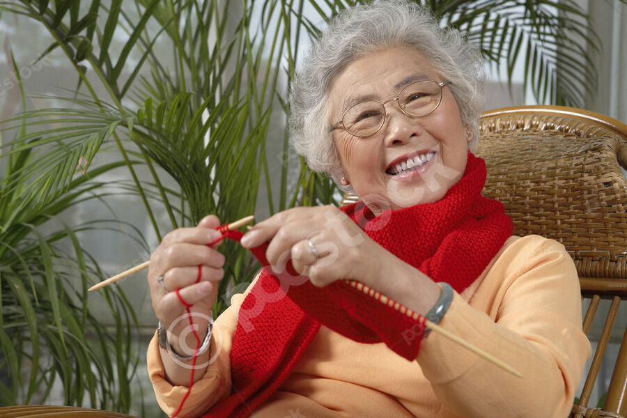 Smiling senior Asian woman knitting scarf while sitting on chair at home