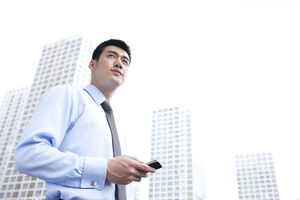 Chinese businessman holding smartphone and looking away while standing near office buildings in city during daytime