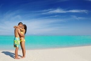 Chinese couple spreading arms looking at each other while standing together on beach during daytime