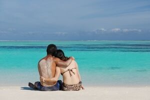 Chinese couple looking at each other while lying down together on sand on beach during daytime