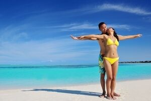 Chinese couple spreading arms looking at each other while standing together on beach during daytime