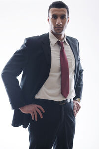 Middle Eastern businessman with hands behind head facing on white background standing standing in studio