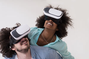 Black and caucasian couple wearing VR headsets having fun piggyback riding and experiencing virtual reality against white background in studio