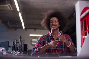 Smiling Black woman in hijab wearing headset standing against white background in studio