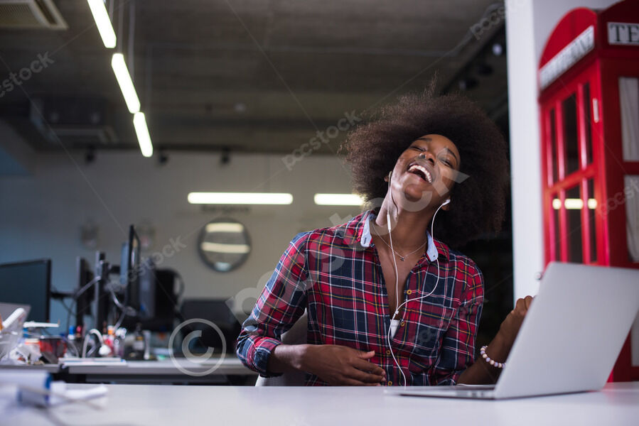 Smiling Black woman in hijab standing with closed eyes and being photographed by cameraman in studio