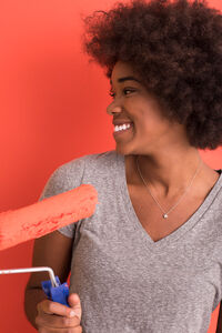 Smiling Black woman with hijab using smart home screen control system while standing at home