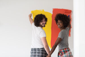 Smiling Black and Middle Eastern women doing arm wrestling challenge while sitting on sofa at home