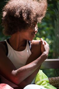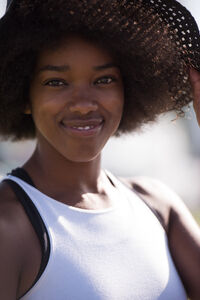 Smiling Black woman with afro wearing white dress and flower headband having fun riding bicycle with basket and pinwheel in park on a sunny day