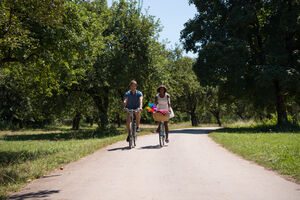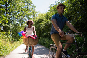 Middle Eastern man with headphones on neck working on his laptop while sitting at table with caucasian woman working together holding tablet standing in office